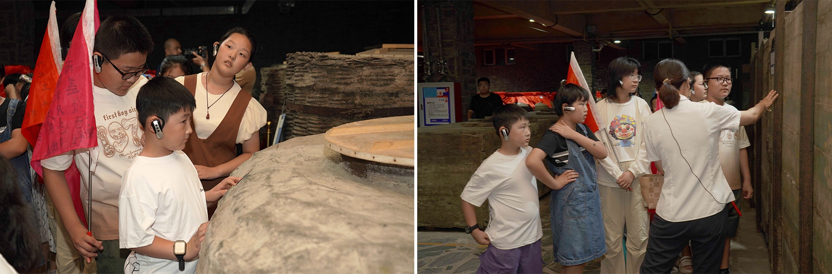 研學首站來到彌漫著酒曲氣息的慶元亨酒坊,孩子們近距離觀察窖池群落,聆聽“國家級非物質文化遺產老五甑釀酒技藝”的釀酒原理。在恒溫恒濕的乾元酒窖,近距離觀察探索酒海、酒簍、陶壇交替儲存的奧秘,他們化身小小觀察員,分組協作,細致追蹤,在實踐記錄中深刻領悟糧食的珍貴與匠心。