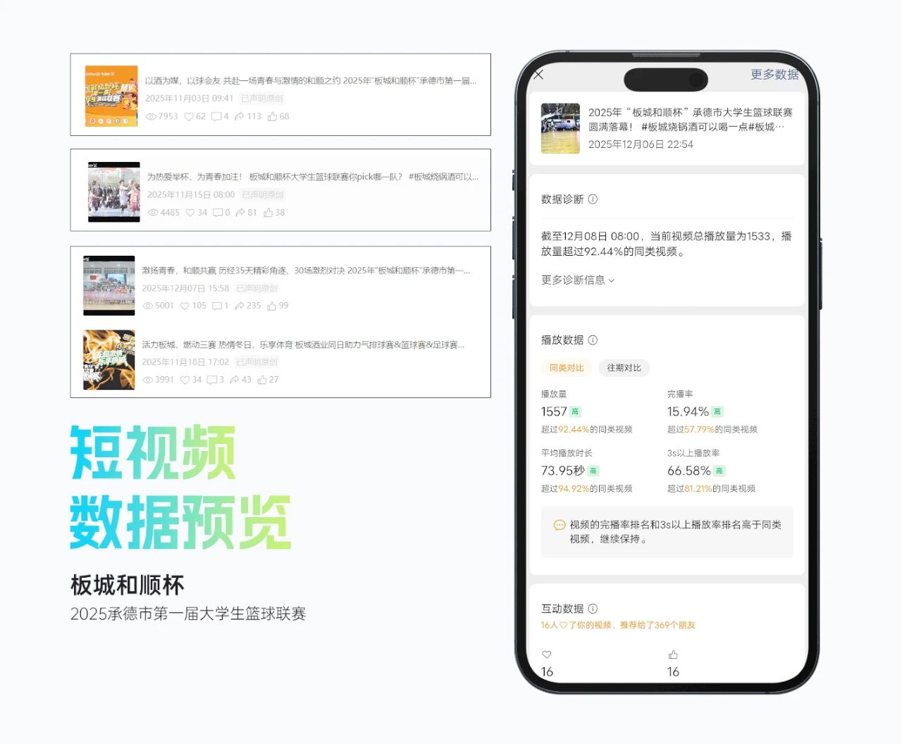 整體活動影響力顯著,賽事抖音曝光超214萬,累計觀看直播人數(shù)超15萬人,現(xiàn)場累計吸引觀眾逾2萬人次,承德市籃球協(xié)會微信公眾號相關(guān)閱讀量超2萬人次,板城酒業(yè)視頻號平臺相關(guān)播放量超2.5萬人次。